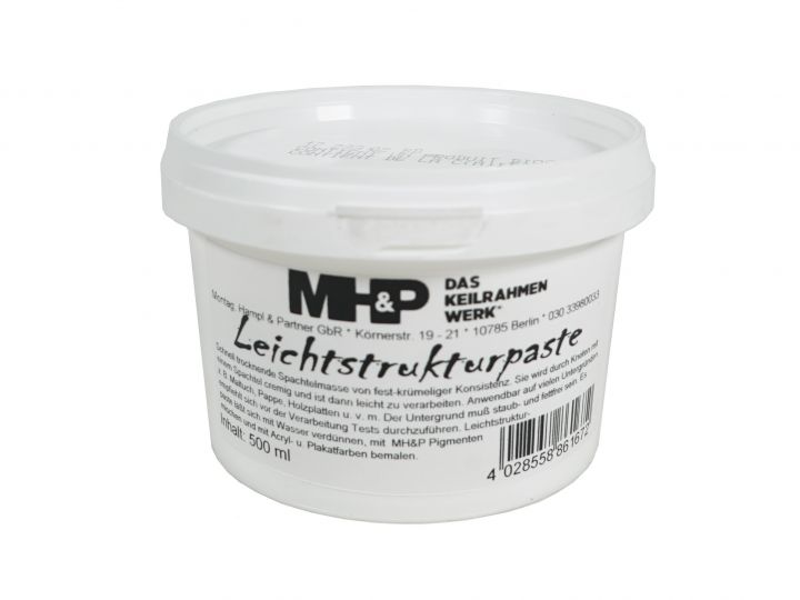 Die Leichtstrukturpaste hat keine Körnung und besteht überwiegend aus Leichtstoffen. Speziell geeignet für begrenzt belastbare Bildträger. Trocknungszeit je nach Dicke des Auftrags ca. 2 bis 12 Stunden. Nach Trocknung weiß und seidenmatt. Um ein Austrocknen im Becher, bei nicht restlos aufgebrauchter Paste, zu verhindern, empfiehlt es sich eine Abdeckung aus Folie. Sollte dennoch die Paste trocken und bröselig erscheinen, lässt Sie sich unter Zugabe von wenig Wasser wieder sämig rühren.